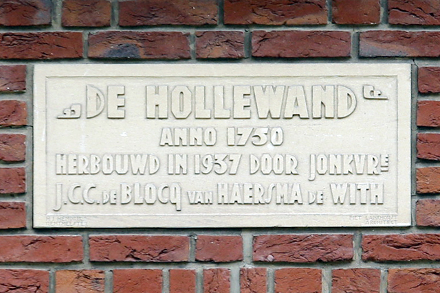 Het pand op Hollewandsweg 38, is gebouwd op de plaats waar ooit de Herberg De Hollewand in 1717 heeft gestaan. Boven de voordeur van het pand is een gevelsteen ingemetseld met de naam van de jonkvrouw J.C.C. de Blocq van Haersma de With en die van de architect van het pand, Piet Lankhorst.